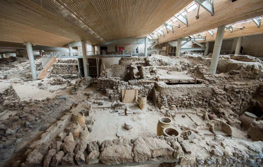 Start with the breath-taking view at the Prophet Elias and visit the picturesque site. Next, discover Pyrgos village, one of the most picturesque villages of the island. Continue to Akrotiri excavations, one of the most significant archaelogical sites. Akrotiri is a vast structure, once habited by 200 families and preserved burried under the volcano’s lava. Then you will have free time (approx 40min.) to see the Red Beach from above to simply enjoy the colorful formations of the mountain and/or visit Akrotiri Bay for coffee or lunch with Greek traditional mezedes and ouzo (not included in the price).